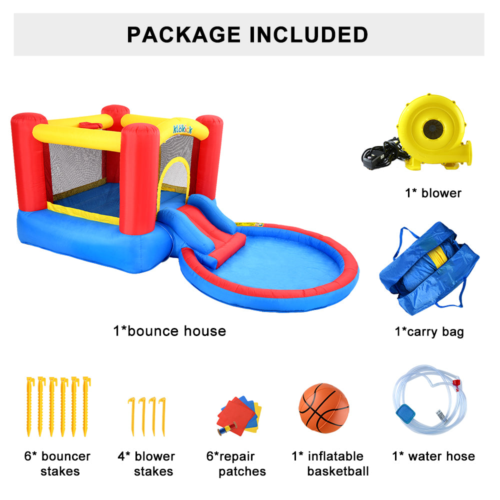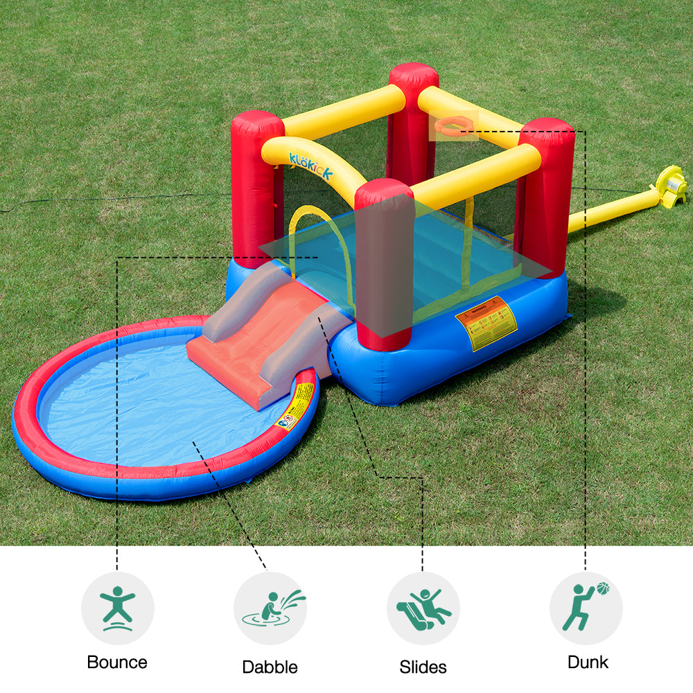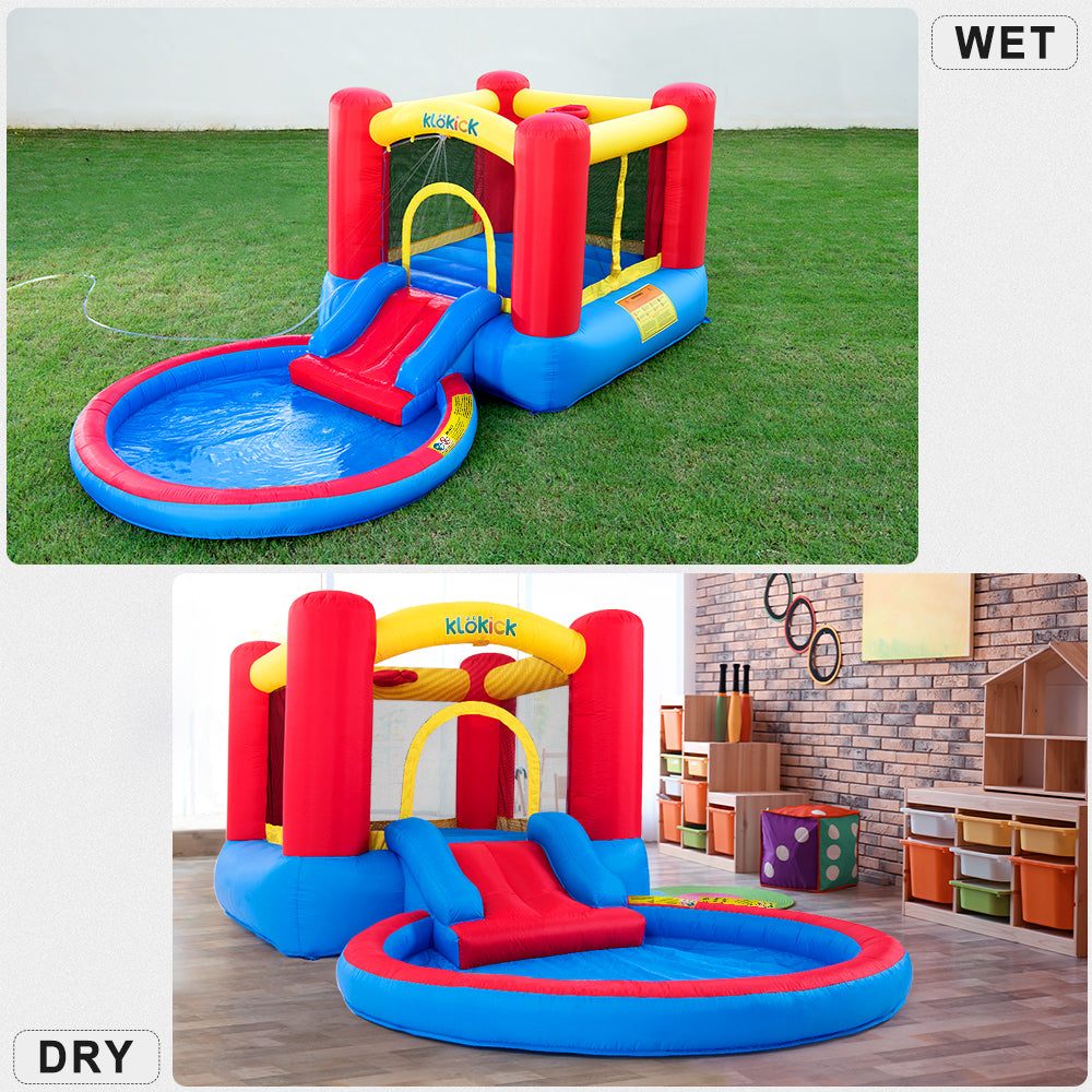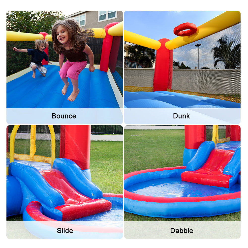 - All-In-One Inflatable Play Park For Kids: This wet and dry bouncer combines a water slide, bounce house, and wading pool all into one. Your little ones will squeal with joy going down the water slide, making a splash with friends, and bouncing on the jumping floor to slam dunk the kid-sized basketball into the hoop - more fun and more creative play than a traditional bouncy house. Great for birthday parties, playgroups, and everyday use.