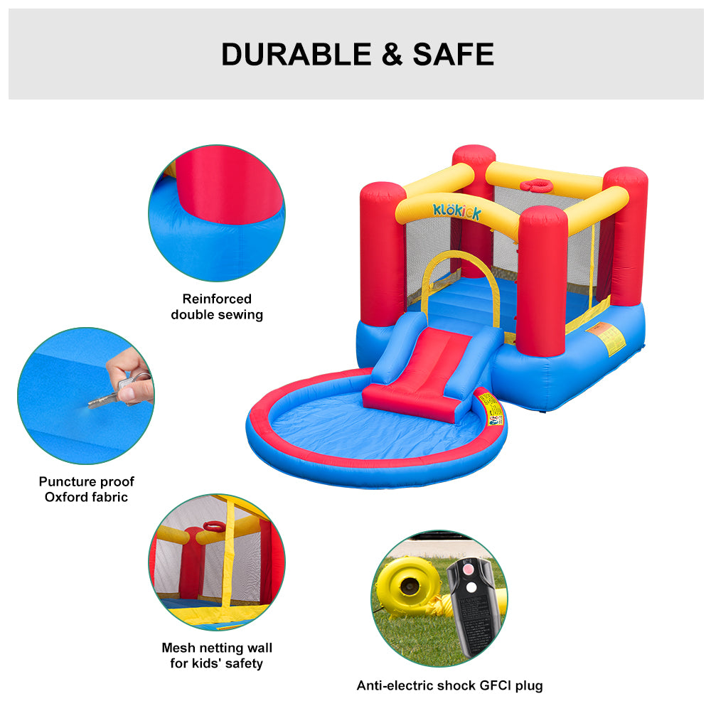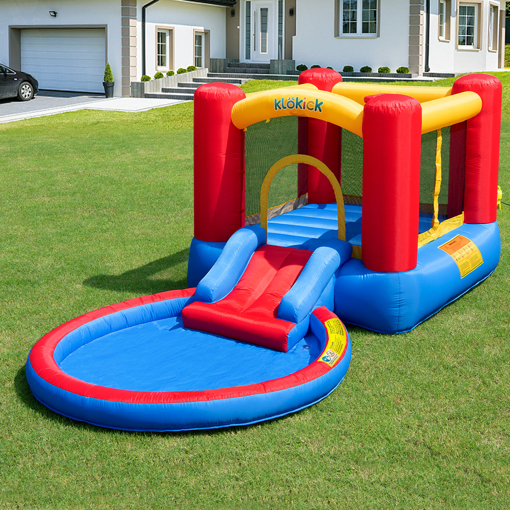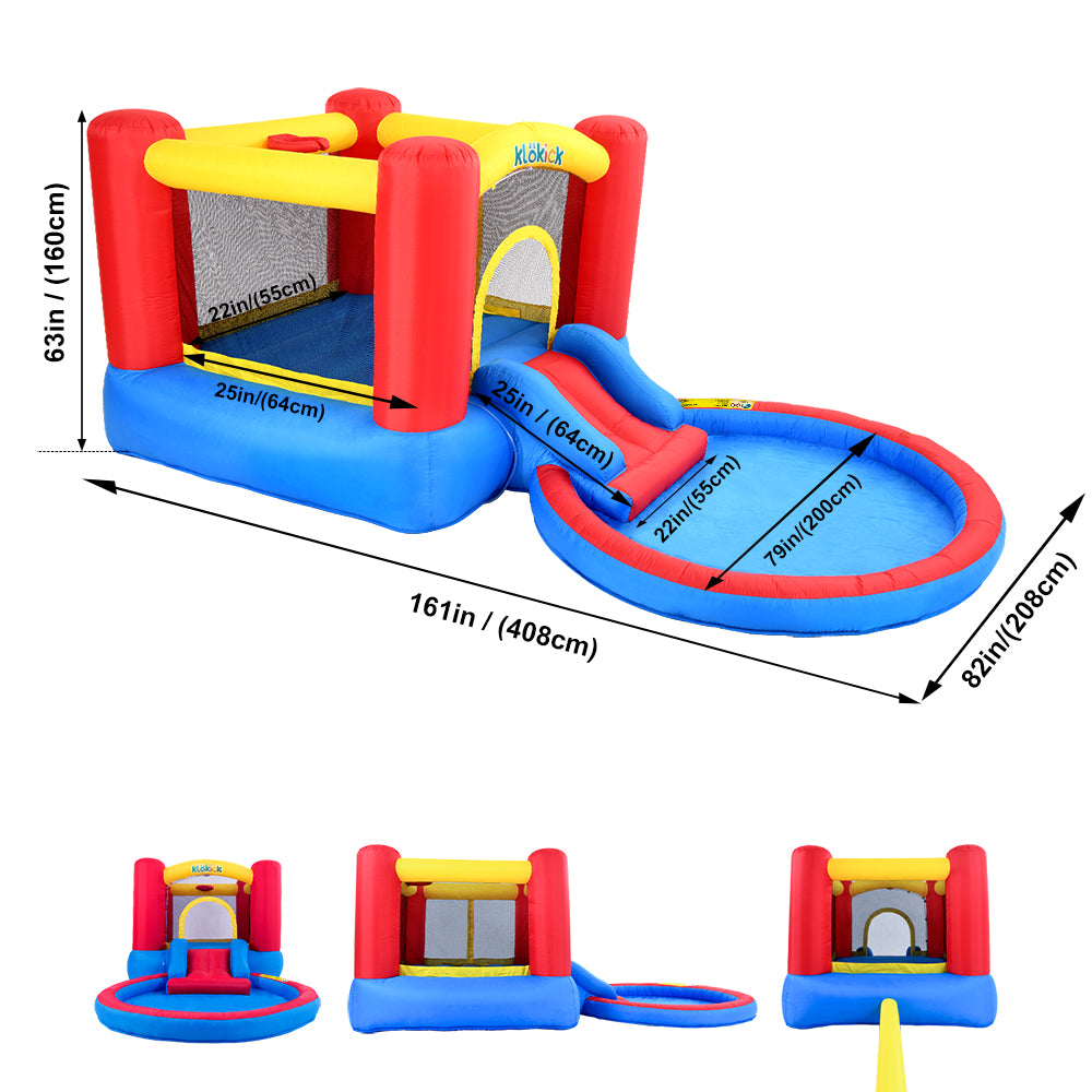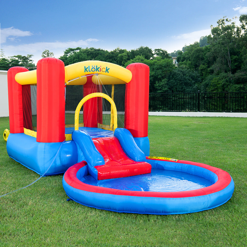 - All-In-One Inflatable Play Park For Kids: This wet and dry bouncer combines a water slide, bounce house, and wading pool all into one. Your little ones will squeal with joy going down the water slide, making a splash with friends, and bouncing on the jumping floor to slam dunk the kid-sized basketball into the hoop - more fun and more creative play than a traditional bouncy house. Great for birthday parties, playgroups, and everyday use.