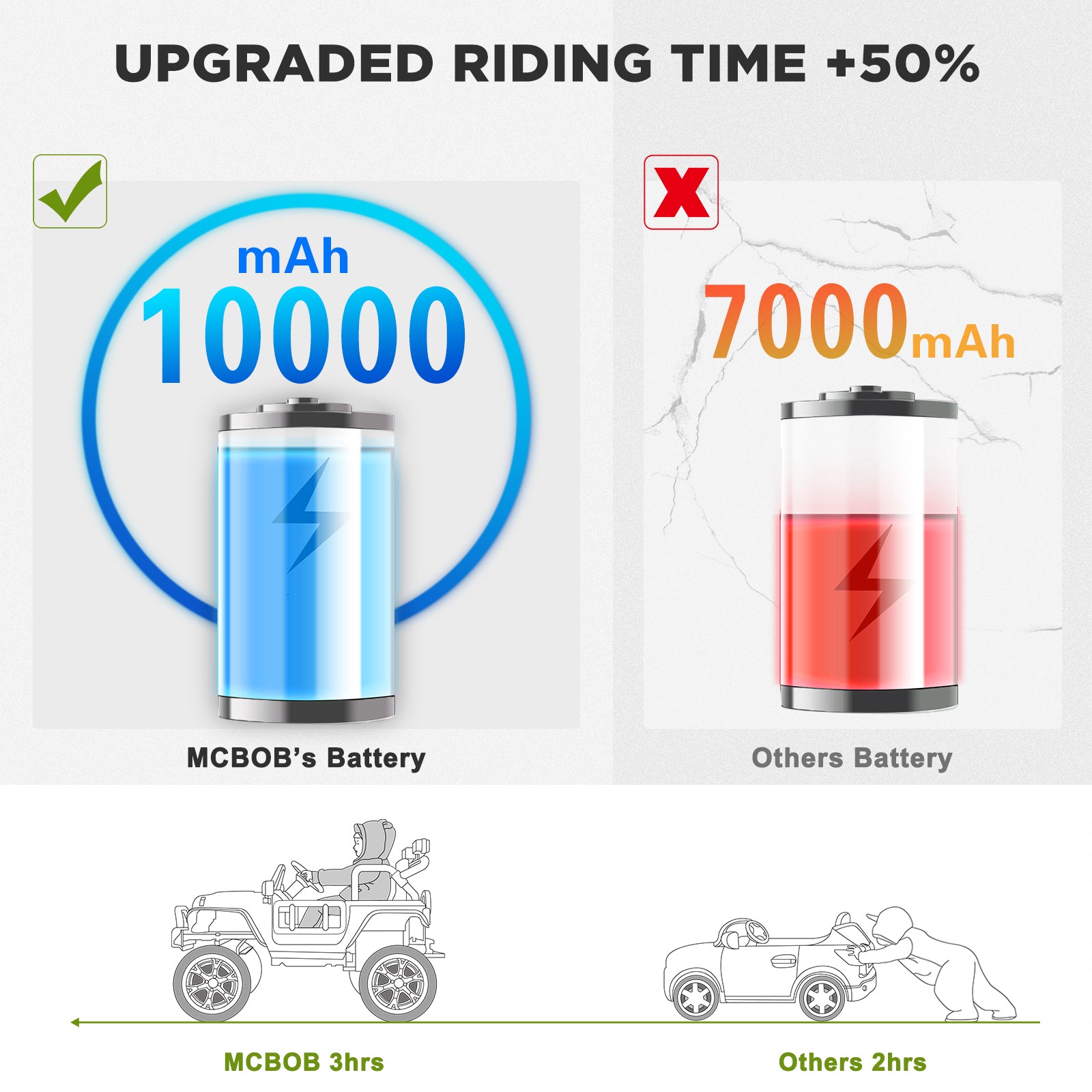 - POWERFUL BATTERY: The car adapts 12V 10Ah batteries as supply power which supports up to 3 hours of playing time at high speed by one full charge. The ultra-long battery life extends children's playing time by 50%.